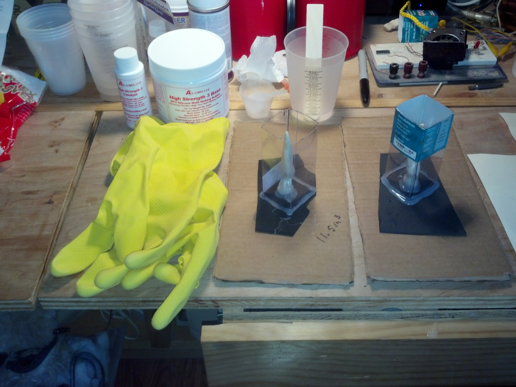 These were exactly what I wanted, so over the next week or two I experimented with pigments in the resin, various amounts of catalyst, and a few other things (including embedding LEDs, just for fun. I was not planning on lit claws for these paws). I finally made eight claws, four of each mold. I designed each paw to have 4 claws.