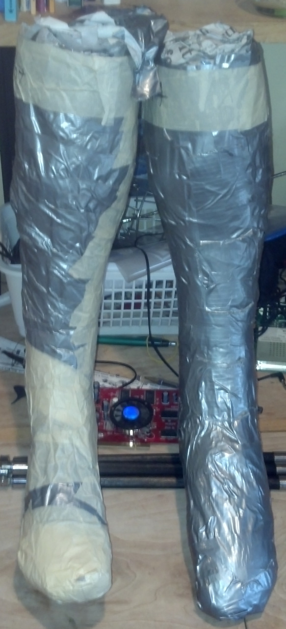 But I had a problem: there was no way I’d be able to construct these on my own leg, and I needed something to keep the sock stretched while I built the paws. So, I made forms of my legs using duct tape. First I took some plastic wrap (I used some plastic we had lying around, but I think some people use Saran wrap) and wrapped one leg up the knee with it. Then I covered it completely with duct tape. After that, I cut the tape down the side to my ankle bone and slipped my foot out. Then I patched up the seam I’d cut in the duct tape with more tape. I stuffed the entire form tightly with newspaper to make it rigid. I considered pouring a plaster cast of it, but was too lazy. Anyway, after I finished both leg forms, here’s what I had: