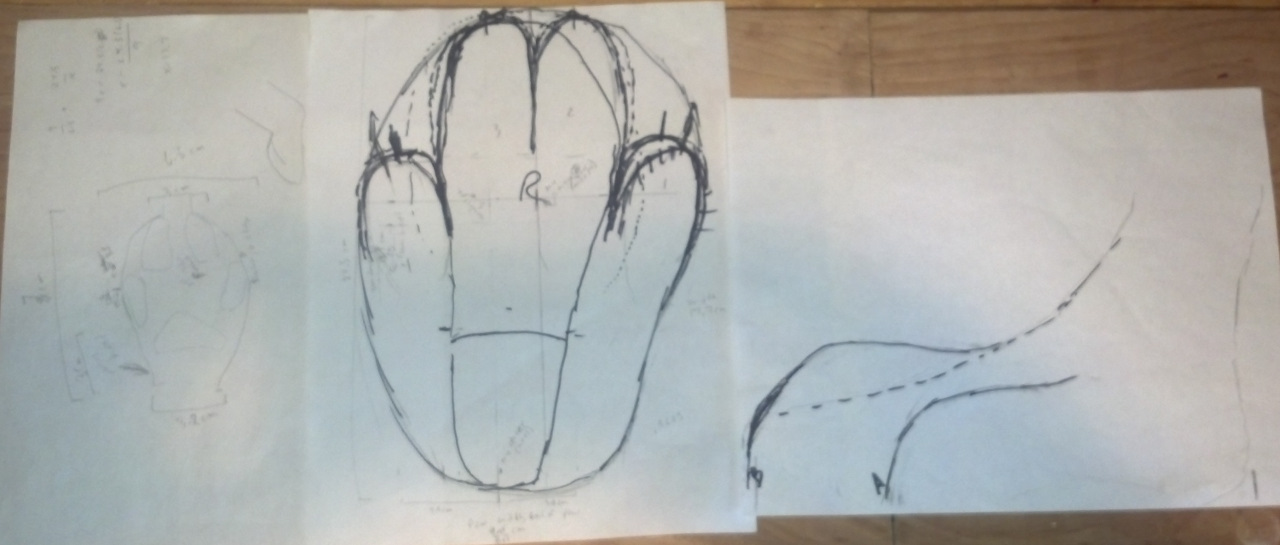 My first step was design. I wanted them to give an appearance of digitigrade or near-digitigrade, so I took an outline of the bottom of my foot and based on its length and width as well as the length and width of the bottom of a fox paw in a photo, and worked out a scaling factor that would transform the shape of the fox paw in the photo to a size that wrapped my foot completely: