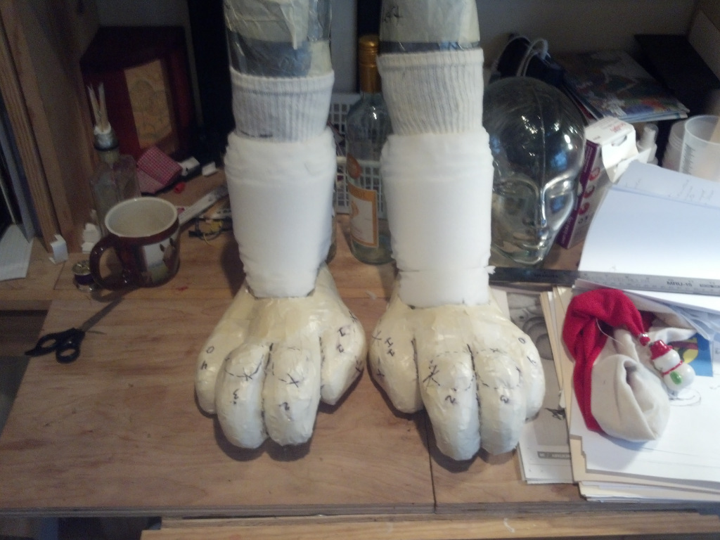 I used the sketches I’d made to guide cutting chunks of poly foam to the 3-D shape of each toe as well as filler chunks here and there and glued them to the tube sock to form up the paws.